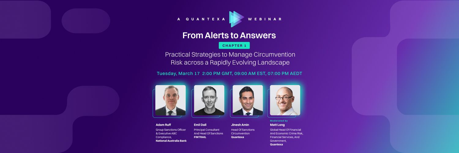 Join the very first chapter of our webinar series “From Alerts to Answers” where industry-leading experts from National Australia Bank, Fintrail and Quantexa will discuss the shifting regulatory environment, the institutional adaptation of control frameworks, and the opportunities and risks of AI and advanced analytics in sanctions compliance.