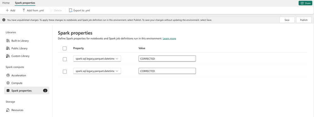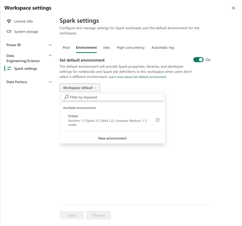 You can set these configuration properties within the Workspace settings in the Fabric UI as shown in the following screenshots: