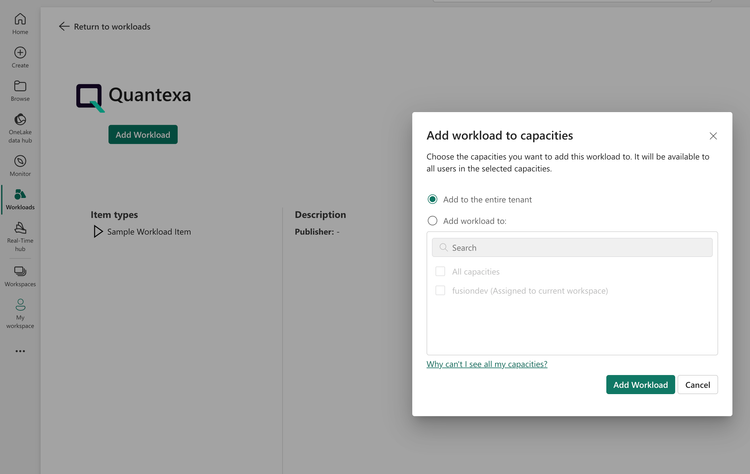 1. Add the Quantexa Unify workload to the tenant, either globally or in a specific capacity