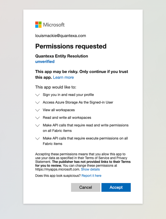 - The first time you launch the Unify workload in Fabric, the frontend launches an authentication flow. This adds an Enterprise Application to the client tenant, which grants delegated permissions to the Quantexa workload on behalf of the current user.