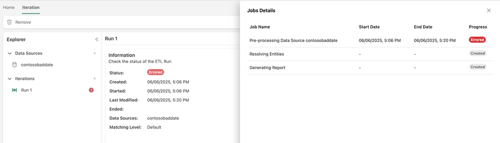 In this instance, you must navigate to the monitoring hub to find the job that failed. The failed job’s name matches the name of the Iteration in the Unify UI.